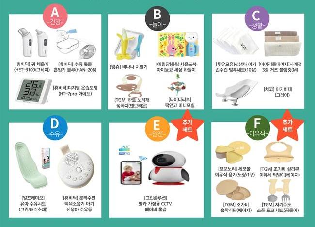 6가지 꾸러미는 ▲건강(귀 체온계, 수동 콧물흡입기, 온습도계 등 3개 품목) ▲놀이(치발기, 사운드북, 노리개 젖꼭지, 미니 모빌 등 4개 품목) ▲생활(아기 손수건, 아기 담요, 아기 비데 등 3개 품목) ▲수유(백색소음기 신생아 수유등, 수유 깔개 등 2개 품목) ▲안전(가정용 카메라(베이비캠) 등 1개 품목) ▲이유식(이유식 용기, 턱받이, 흡착식판, 자기주도 스푼포크 등 4개 품목)으로 구성돼 있다.